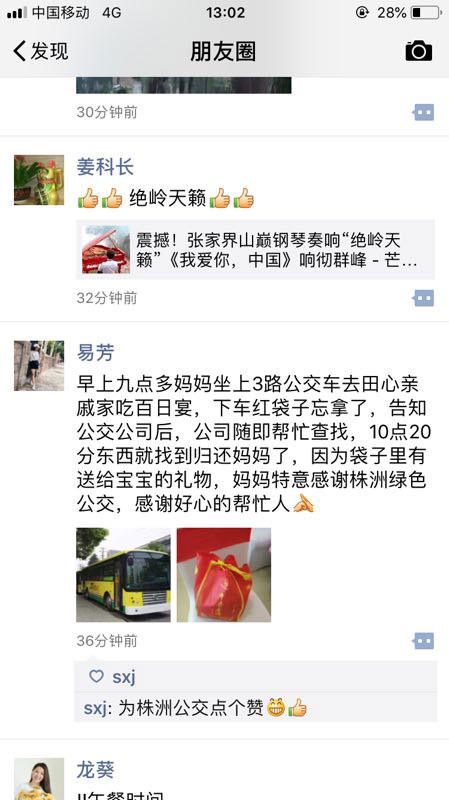 當天中午1點,失主楊女士的女兒發(fā)朋友圈感謝綠色公交,感謝好心的幫忙人。
