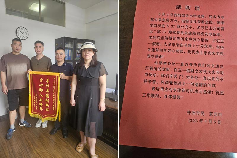 "太感謝朱師傅了!老人家年紀大,記憶力不好,正趕五一假期,人多車雜在馬路上十分危險,幸得朱建新師傅好心幫助,我代表全家再次向朱師傅表示感謝!"5月6日,老人家屬來到巴士公司向朱建新師傅送上錦旗與感謝信表示感謝。
