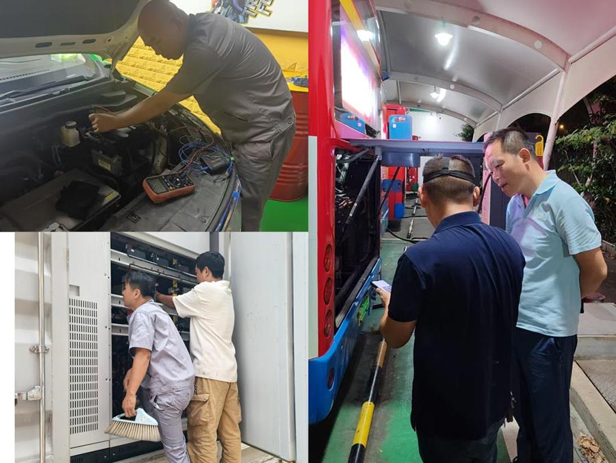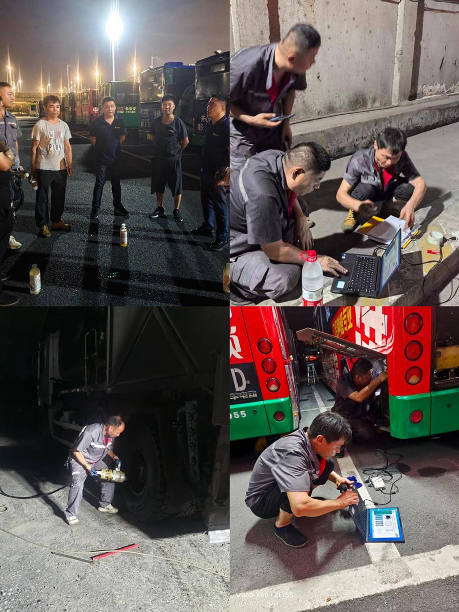 深夜來臨,多數(shù)人已在空調(diào)房安睡,維修師傅們?nèi)栽趷灍嶂懈┥砉常_展動力電池專項檢測與拆裝,汗水浸透工裝、油污沾滿雙手仍精準(zhǔn)操作,為公交車筑牢安全屏障。面對外部任務(wù),國信公司設(shè)備故障,他們連夜趕往現(xiàn)場排查修復(fù);工程車急需換胎,他們火速到場保障施工;湖南工業(yè)大學(xué)箱變充電柜突發(fā)故障,他們及時處置恢復(fù)供電;北汽銀建公司的新能源車控制器搶修等,高效響應(yīng)各類搶修需求。