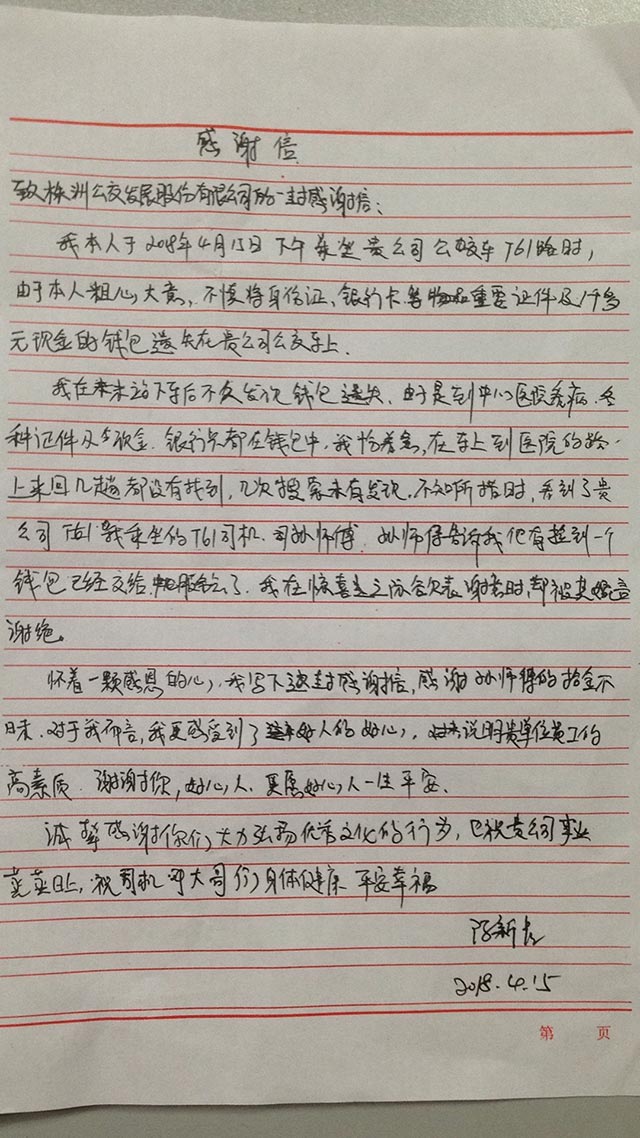 通過這封沉甸甸的感謝信,我們得知,4月15日下午13:20左右,駕駛T61路湘B07902#車的孫師傅返回中心醫(yī)院站點(diǎn),在清掃車廂時在車廂后座與車身的縫隙間拾到了一個黑色錢包,便上交中心醫(yī)院站調(diào)室登記備案,經(jīng)檢查,錢包內(nèi)有1500多元現(xiàn)金、身份證、社保卡及多張銀行卡。孫師傅及工作人員馬上通過工作微信群等方式通知線路駕駛員留意報(bào)失人員,配合尋找,以便盡快歸還失物。經(jīng)過一番聯(lián)系、尋找,錢包回到了失主陳先生手中。